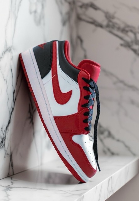 ![]() | A Nike shoe on marble shelves. The shoe heel is touching the left wall, while the shoe top lays on the marble shelf. | ![]() |